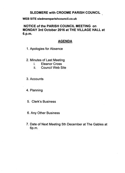 NOTICE of the PARISH COUNCIL MEETING on MONDAY 5th FEBUARY 2018 at VILLAGE HALL at 6p.m.